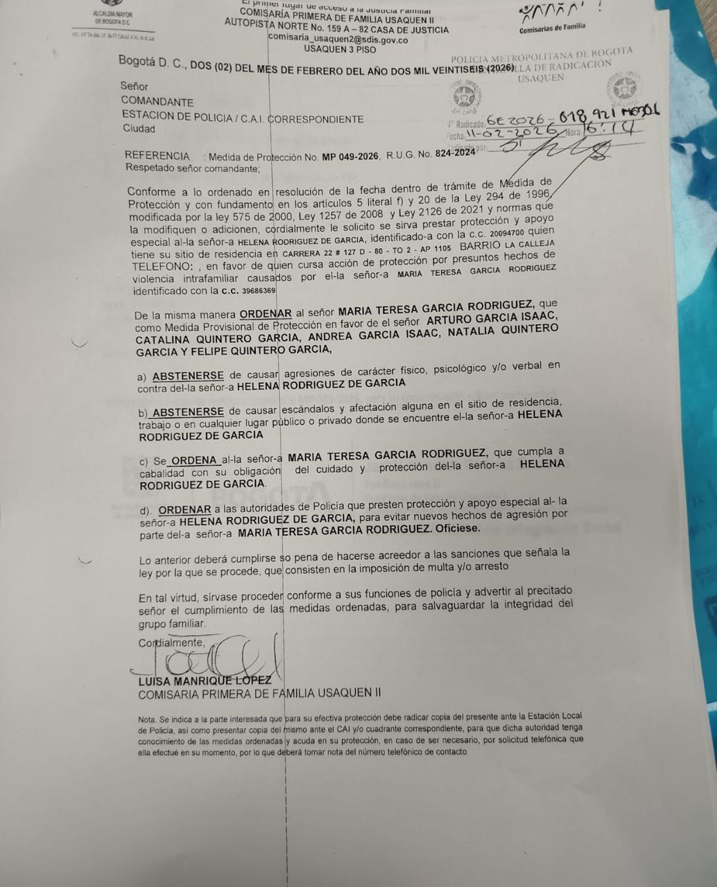 Los documentos que reposan en la Fiscalía 380 Unidad de Violencia Intrafamiliar y en la Comisaría Segunda de Usaquén describen un escenario de «secuestro emocional». Se señala a María Teresa de constreñir a su madre para firmar documentos oficiales, maniobra con la que buscaría asegurar el control absoluto del patrimonio.