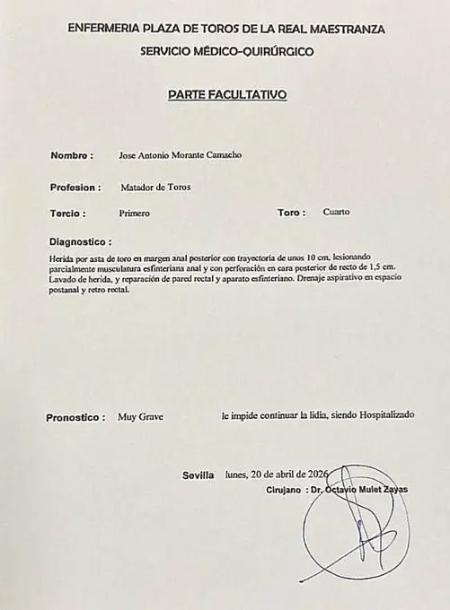 El pronóstico oficial del torero lo califica de ‘muy grave’. Morante de la Puebla permanecerá hospitalizado bajo estricta supervisión médica a la espera de su evolución en las próximas horas.