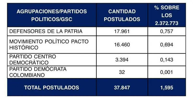 Según información consolidada del artículo 5 de la Ley 163 de 1994, esta cifra supera a otras organizaciones políticas. El movimiento político Pacto Histórico registró 16.460 candidatos, mientras que el Partido Centro Democrático llegó a 3.394 y el Partido Demócrata Colombiano a 32, para un total de 37.847 ciudadanos nominados durante las campañas presidenciales.