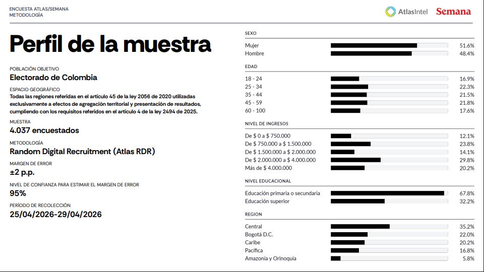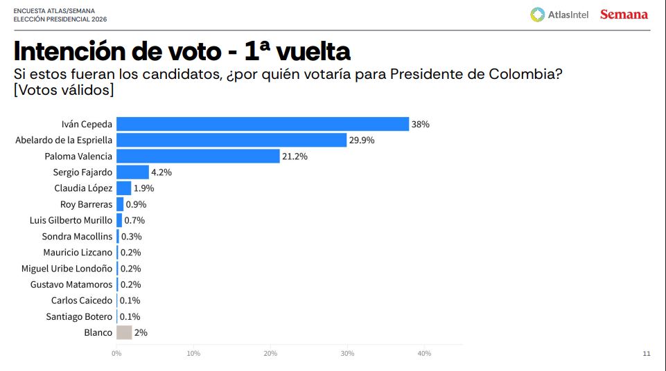 A poco más de un mes de la primera vuelta de las elecciones presidenciales de 2026, el mapa político de Colombia comienza a tomar forma. La última encuesta de AtlasIntel, la encuestadora más certera del mundo, realizada para la revista SEMANA, revela un importante giro en la carrera hacia la derecha: el candidato de Defensores de la Patria, Abelardo de la Espriella, tomó una importante ventaja sobre Paloma Valencia y se proyecta como el principal oponente de Iván Cepeda.