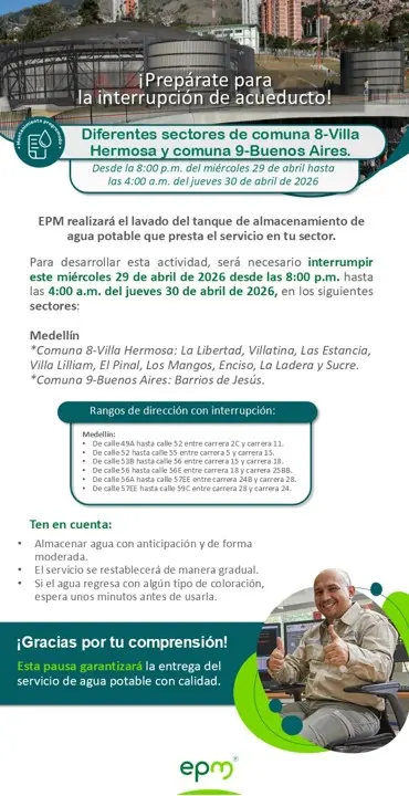 Minuto30.com .- Empresas públicas Medellín (EPM) informa que habrá una interrupción prevista del servicio de acueducto debido al mantenimiento y lavado del tanque de almacenamiento de agua potable. La medida afectará a varios sectores de los municipios 8 (Villa Hermosa) y 9 (Buenos Aires), a partir del miércoles 29 de abril a las 20:00 horas y hasta el jueves 30 de abril de 2026 a las 04:00 horas.